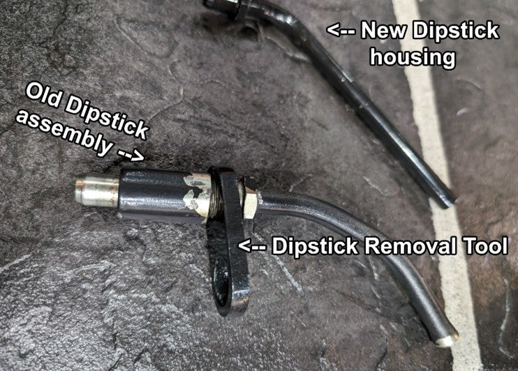 To use the dipstick removal tool, which looks like a small plate with two holes drilled in it, simply unthread the dipstick, then thread one of the holes in the threaded portion of the dipstick and tighten it up. At this point, simply use a hammer, or hammer and punch, from underneath the dipstick to remove it from the block.