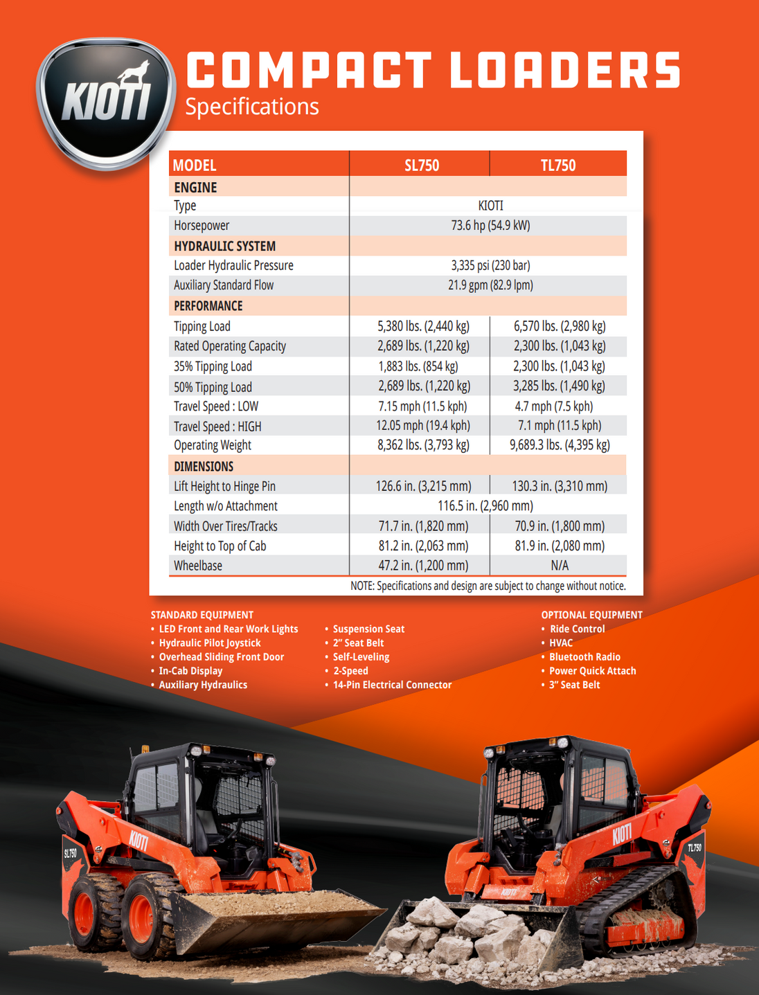 Strength, control, and comfort come together in the KIOTI SL750 Skid Steer. Designed to deliver top-tier performance on any job site, the SL750 combines exceptional lift power and hydraulic capability with a premium operator experience — making it the perfect choice for contractors, landscapers, and property managers who demand more from their equipment.