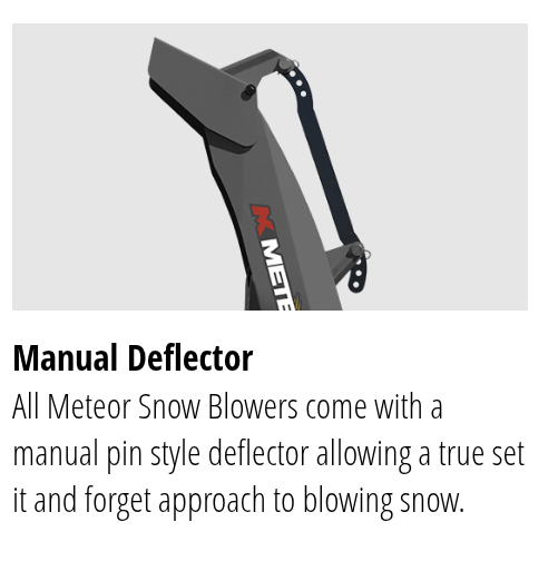 Meteor Snow Blowers for Skid Steer Loaders feature one piece side plate construction for added strength and rigidity. They also feature an offset chute for better operator vision.