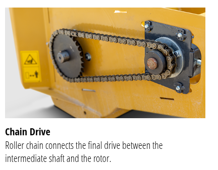 While being easy to attach with no drive lines or hoses to worry about, the engine belt drives the shaft which transfers power to the rotor by a roller chain.