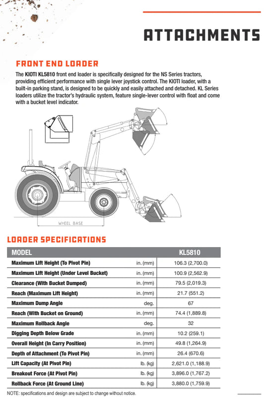 KIOTI KL5810 Loader Pkg w/72in QA Bucket and Grill Guard [Fits NS10]