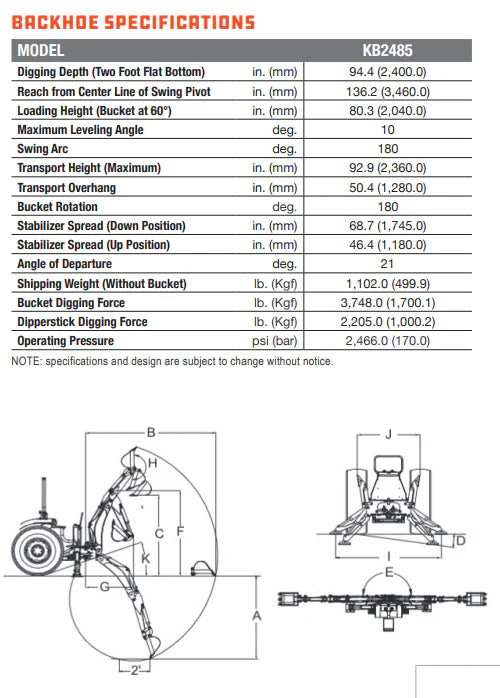 Detailed Specifications (KB2485 Backhoe)